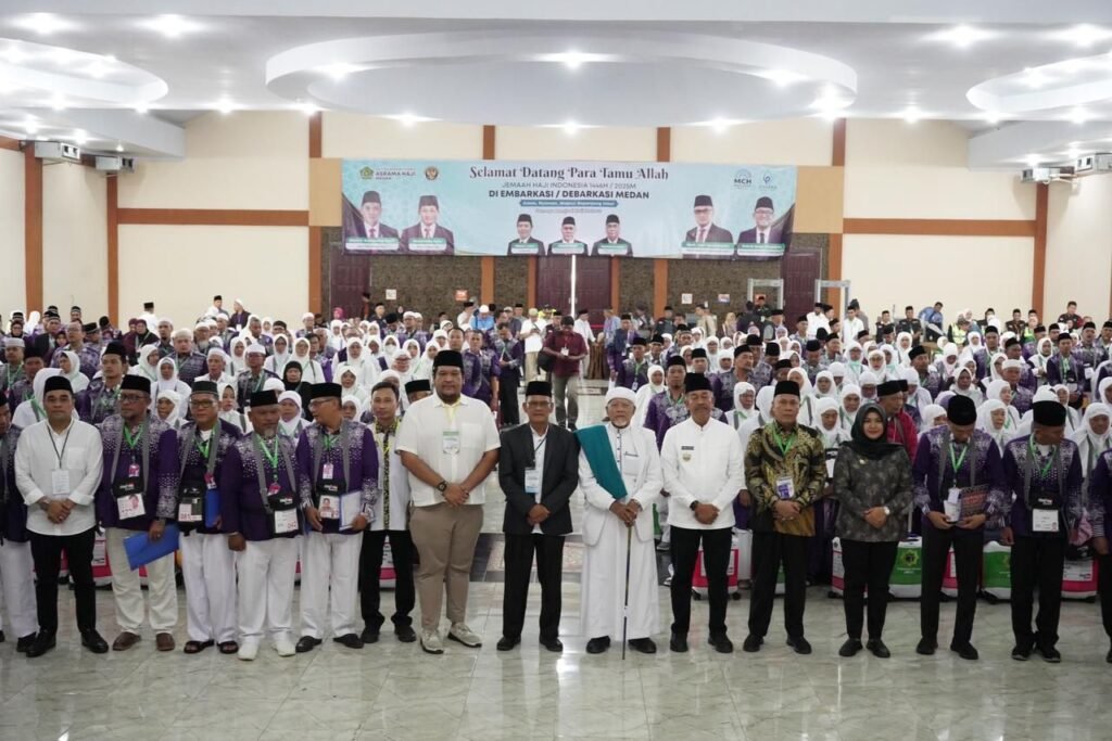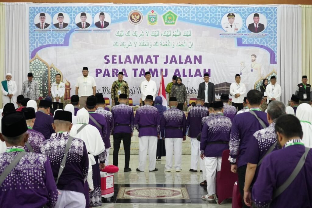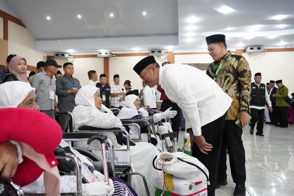 Saipullah Nasution, SH, MM melepas secara resmi keberangkatan jemaah calhaj melalui penyerahan Pataka Merah Putih kepada TPHI Kloter 10 Embarkasi Medan dan penyerahan surat-surat kepercayaan kepada Petuas Kloter di Aula 1 Madinatul Hujjaj Asrama Haji Medan, Minggu (11/5/2025).