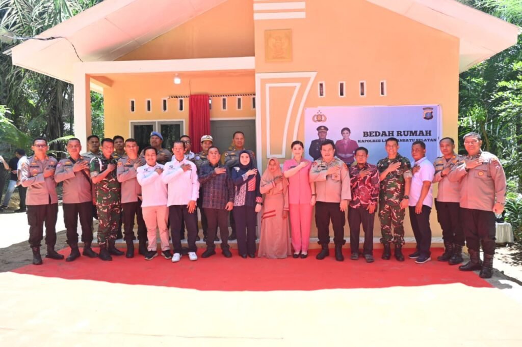 Kapolres Labusel, AKBP Aditya SP Sembiring Muham, meresmikan hasil program bedah rumah dan secara simbolis menyerahkan kunci rumah kepada Junaedi dan keluarga, warga Dusun Pasar 12, Desa Aek Batu, Kecamatan Torgamba, Kabupaten Labusel, Sabtu (1/11/2025).