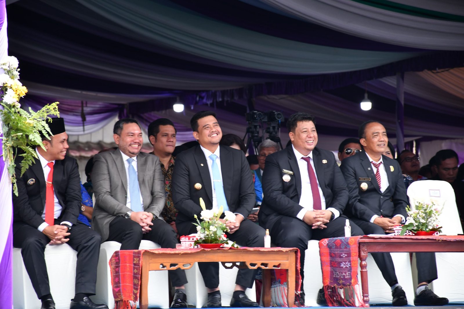 Bupati Vandiko T Gultom, Wakil Bupati (Wabup) Samosir bersama Gubernur Sumatera Utara (Gubsu) Bobby Afif Nasution mengikuti acara peringatan Hari Jadi Kabupaten Samosir yang ke-21 di halaman parkir Kantor Bupati tersebut.