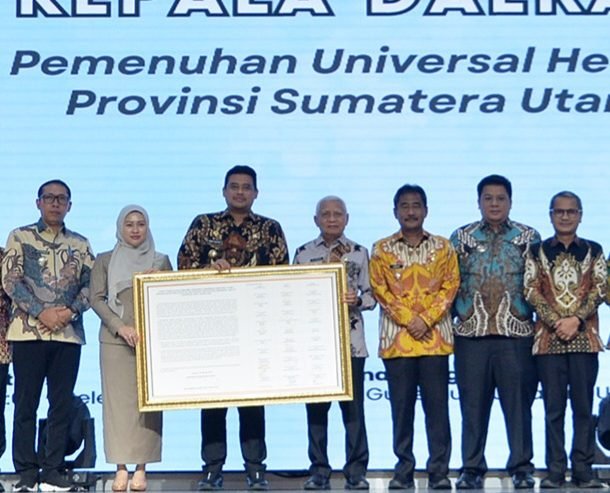 Bupati Samosir Vandiko Timotius Gultom, ST, bersama seluruh Kepala Daerah se-Sumatera Utara (Sumut) melakukan penandatanganan komitmen guna mendukung pemenuhan Universal Health Coverage (UHC) tahun 2025 di Sumut.