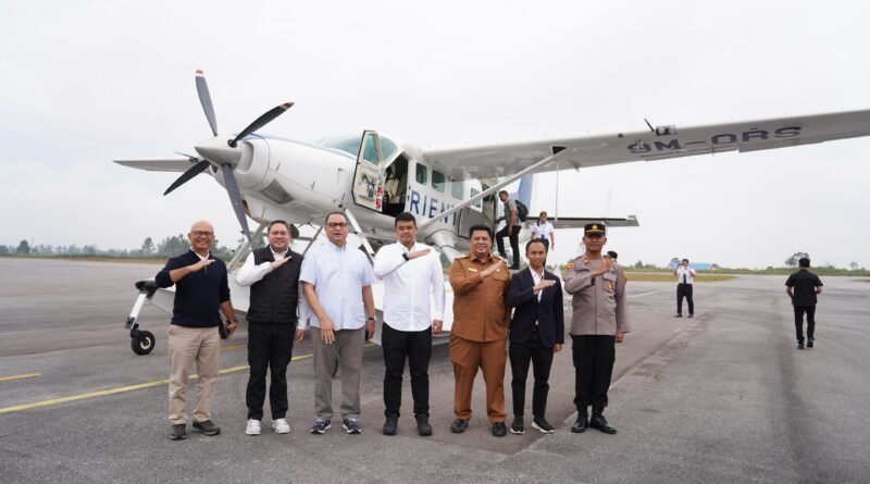 Gubernur Sumatera Utara (Gubsu) Muhamamd Bobby Afif Nasution bersama Bupati Samosir Vandiko T Gultom dan Bupati Pakpak Barat Frans Bernard Tumanggor mencoba ujicoba penerbangan perdana pesawat Amfibi dari Bandara Silangit, menuju Pelabuhan Mariana Resort Tuktuk Siadong, Kec. Simanindo.
