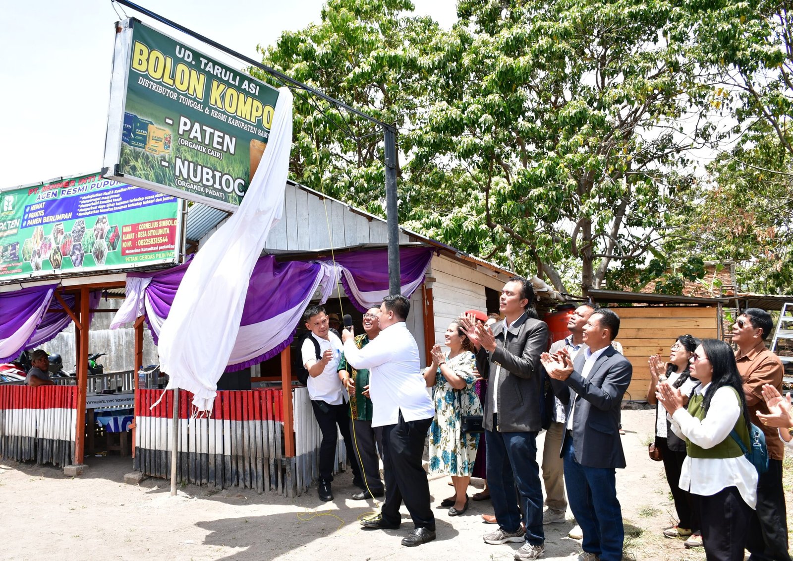Bupati Vandiko T Gultom secara resmi membuka selubung sebagai tanda peresmian Gudang Bolon Kompos, UD. Taruli Asi di Desa Sitolu Huta Pangururan, Samosir.