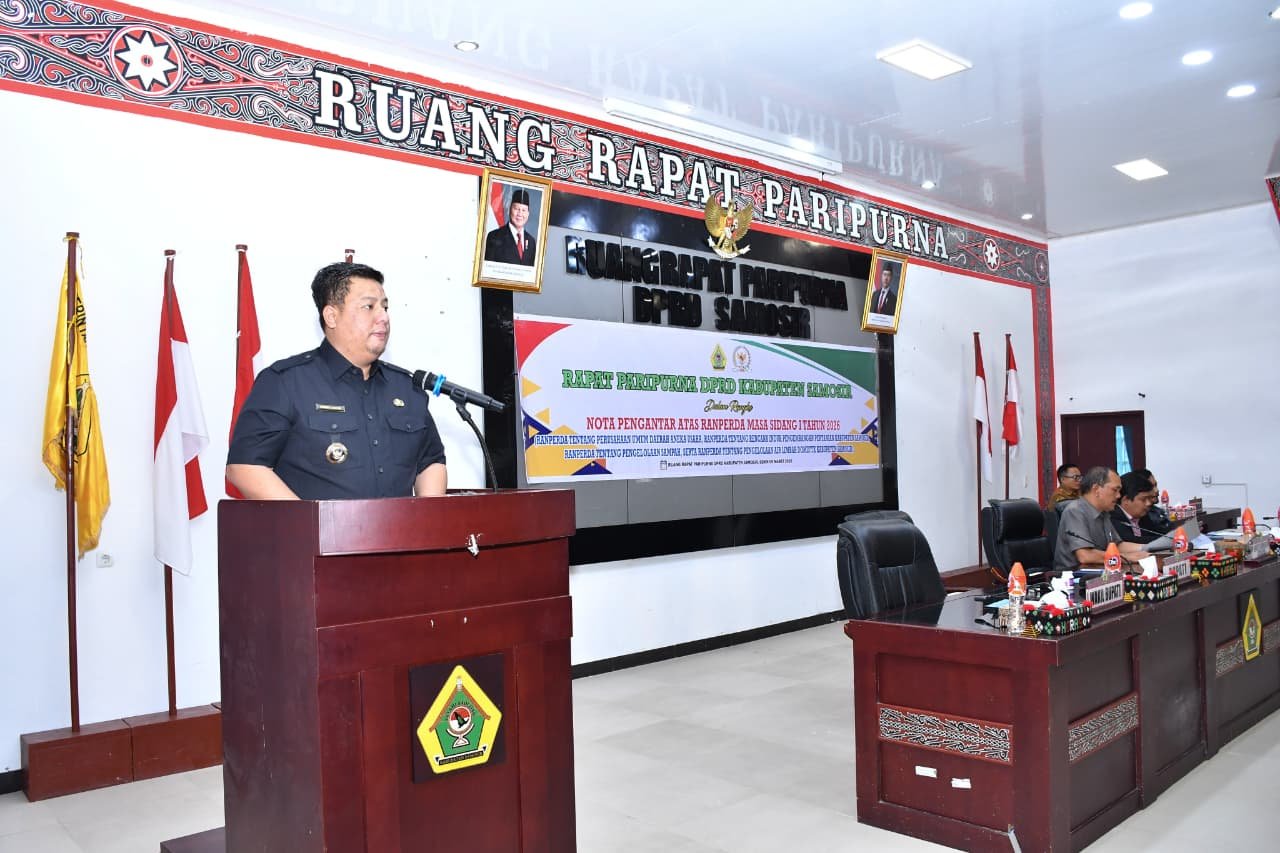 Bupati Samosir Vandiko T. Gultom menyampaikan nota pengantar terhadap empat (4) Rancangan Peraturan Daerah (Ranperda) pada Rapat Paripurna DPRD Kabupaten Samosir di Gedung DPRD tersebut.