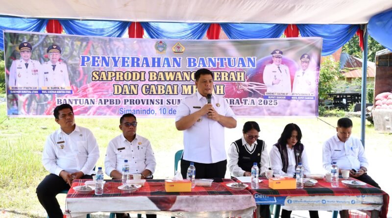 Setelah menyalurkan 12,5 ton bibit padi beberapa hari lalu, Bupati Samosir kembali menyerahkan bantuan Saprodi “Sumut Berkah” berupa bibit bawang merah juga cabai merah kepada 16 kelompok tani, yang dilaksanakan di Desa Cinta Dame Simanindo.