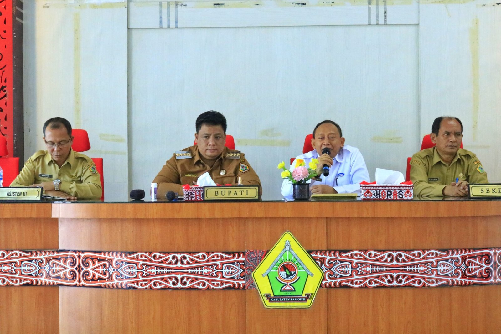 Bupati Vandiko T. Gultom didampingi Sekdakab Marudut Tua Sitinjak, Asisten III Arnod Sitorus menerima kehadiran BPKP Sumut sekaligus membuka kegiatan Entry meeting Evaluasi perencanaan penganggaran/ program Pemerintah Kabupaten (Pemkab) Samosir, di Aula Kantor Bupati Samosir.