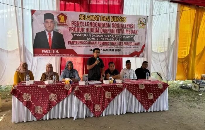 Tindakan responsif ditunjukkan Wakil Ketua Fraksi Gerindra DPRD Kota Medan, Fauzi, saat menggelar Sosper Nomor 3 Tahun 2021 tentang Penyelenggaraan Adminduk di Jalan Mahkamah, Kelurahan Mesjid, Kecamatan Medan Kota, Sabtu (17/1/2026).