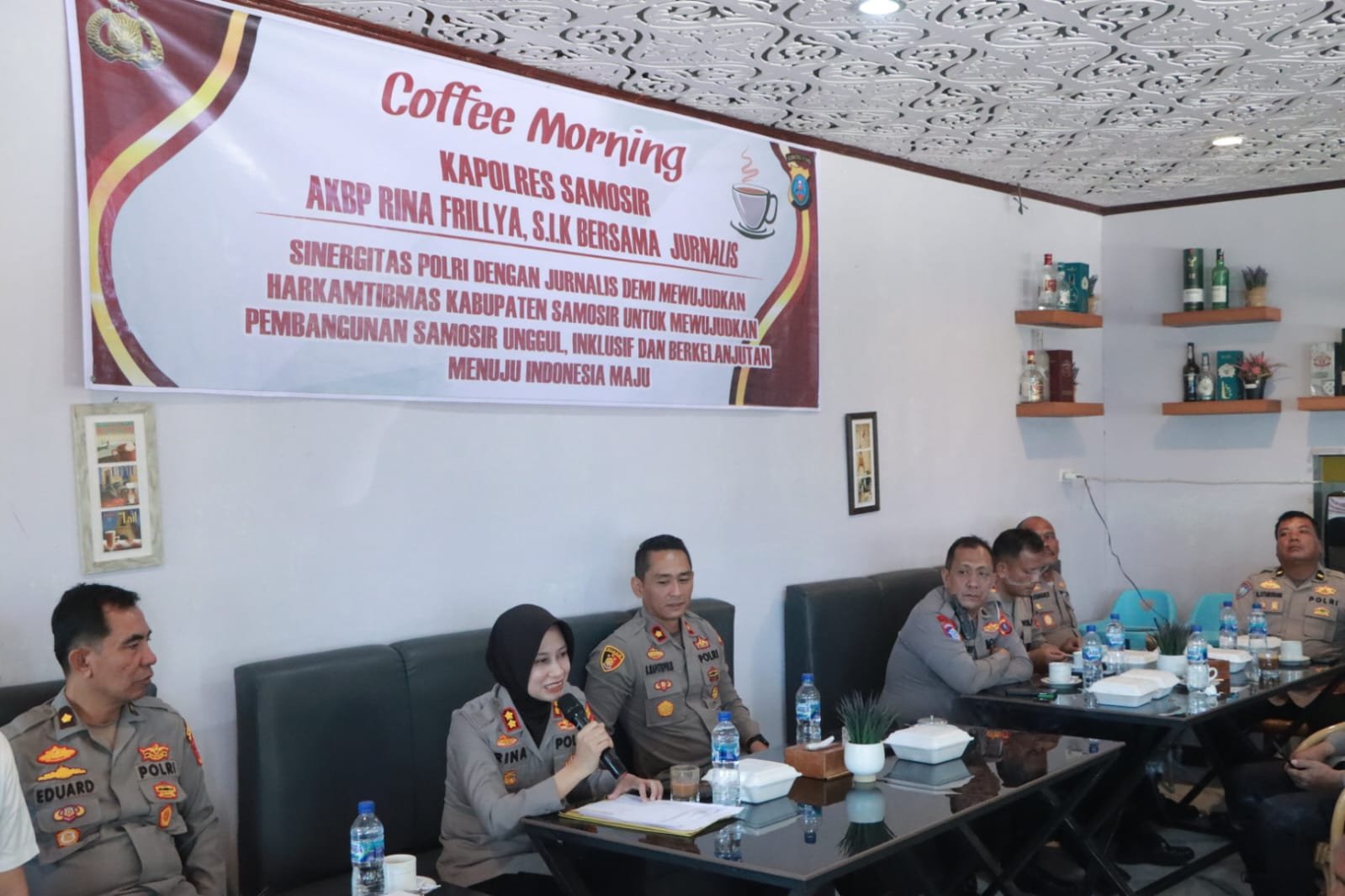 Kapolres Samosir AKBP Rina Frillya, S.I.K menggelar Coffee Morning bersama jurnalis Kabupaten Samosir.