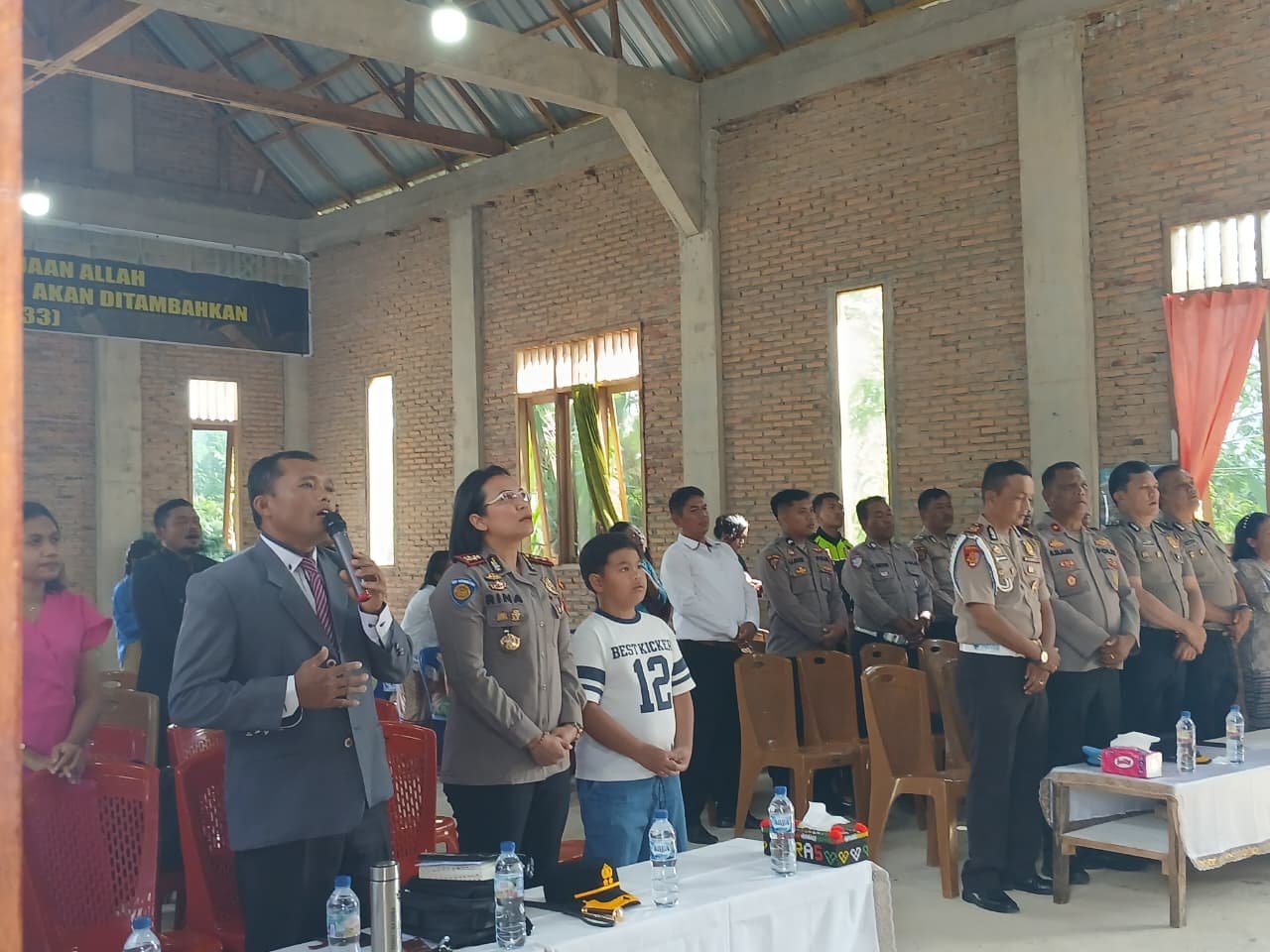 Kapolres Samosir, Rina Sry Nirwana Tarigan yang didampingi Kapolsek Onanrunggu Kompol Marlan Silalahi, para Pejabat Utama (PJU), serta jajaran Polsek Onanrunggu, tiba di lokasi dan bersama jemaat memasuki gereja untuk mengikuti ibadah.
