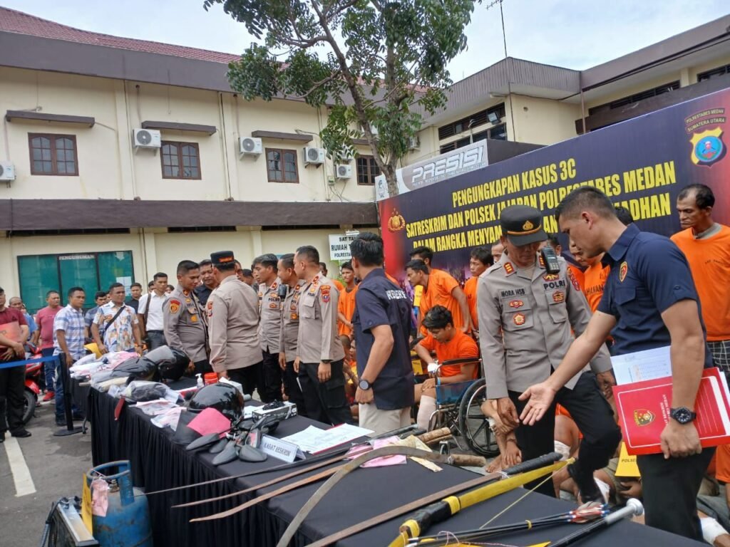 Kapolrestabes Medan,Noktahsumutcom Kombes Pol Gidion Arif Setiawan SIK MH, tidak ada tempat bagi pelaku kejahatan di di wilayah hukum (Wilkum) Polrestabes Medan dan juga seluruh Polsek jajarannya, hal ini ditegsskan Kapolrestabes Medan, saat mengelar paparan kasus 3C (Curat, Curas dan Curanmor) aksi begal dan geng motor (Gemot) bertempat di halaman Mapolrestabes Medan, Jalan H.M Said No.1 Medan, Kamis (27/2/2025) sekira pukul 15.00 Wib.