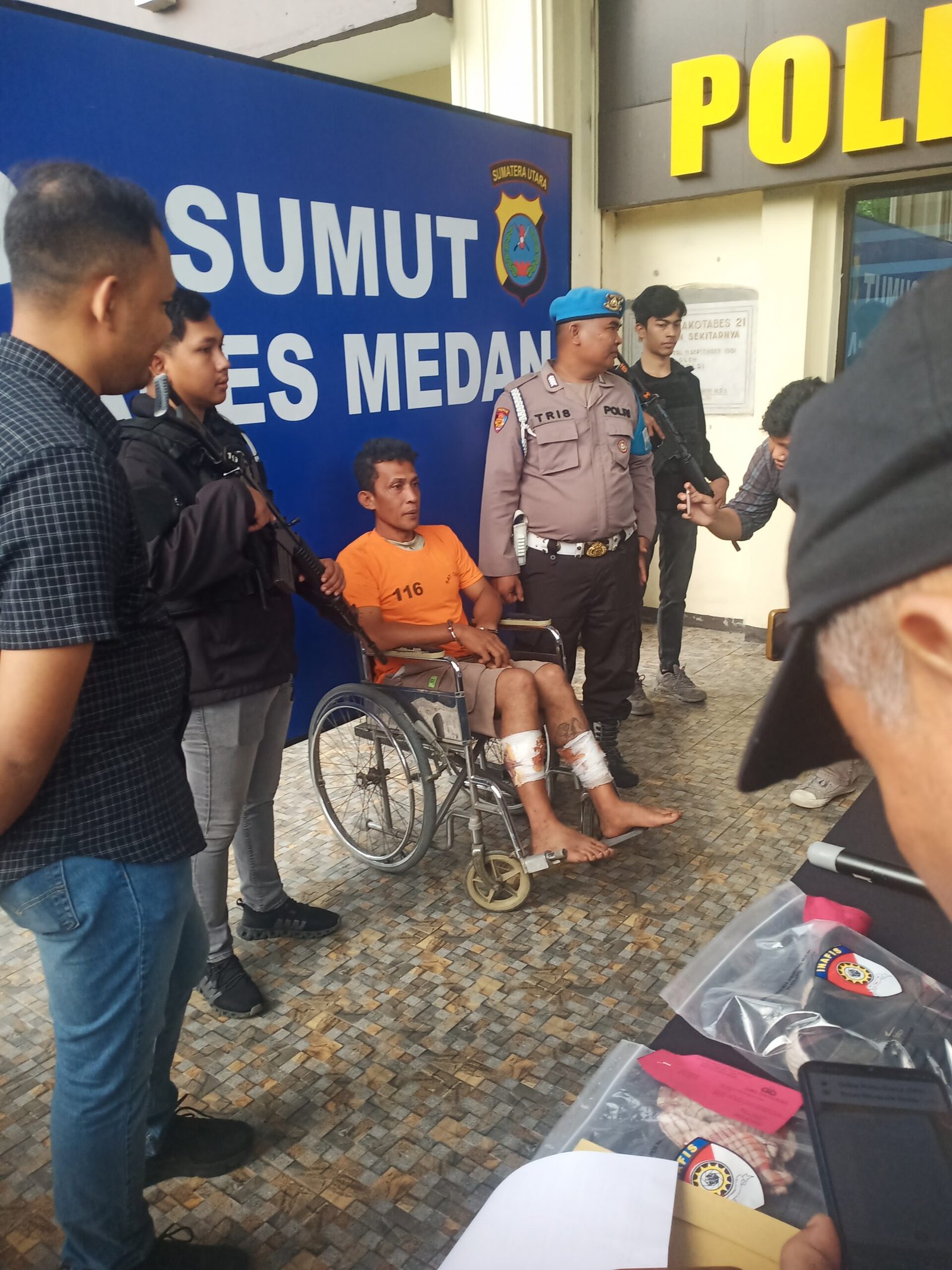 Pelaku F yang merupakan warga Bunga Karpiol, ladang Bambu daerah Kutalimbaru, terlihat dibopong oleh petugas menggunakan kursi roda, karena kakinya terpaksa ditembak oleh petugas karena melawan dan membahayakan jiwa petugas kepolisian yang mengamankannya.