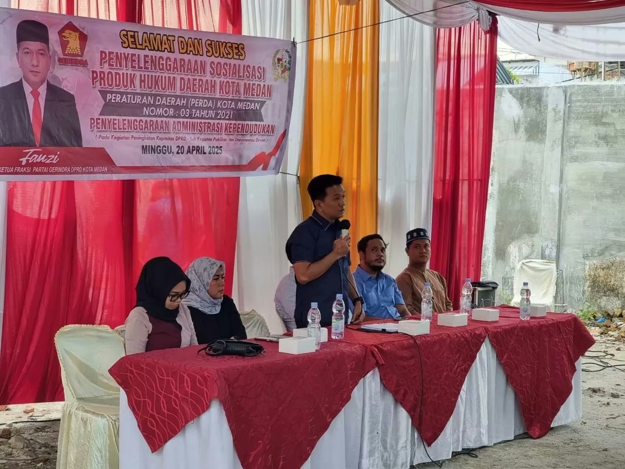 MEDAN,NoktahsumutcoAnggota Komisi I DPRD Kota Medan, Fauzi, kembali mengimbau masyarakat agar tertib administrasi kependudukan (adminduk). Pernyataan itu disampaikan Fauzi saat menggelar Sosialisasi Perda Kota Medan Nomor 3 Tahun 2021 tentang Penyelenggaraan Administrasi Kependudukan di Jalan Dwikora, Kecamatan Medan Amplas dan Jalan Amaliun, Kecamatan Medan Area, Minggu (20/4/2025).
