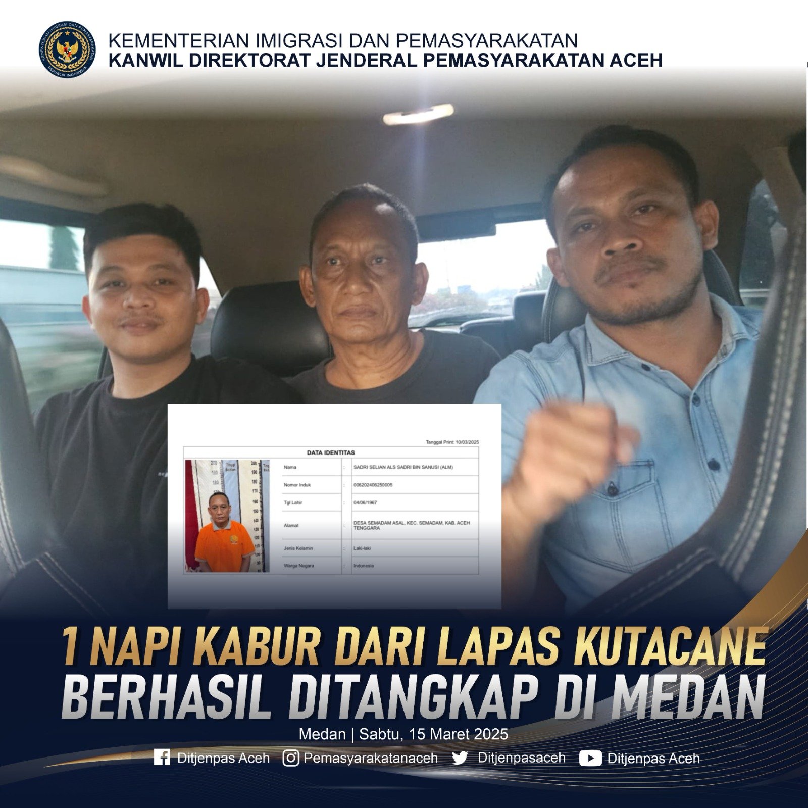 Kepala Bidang Pembimbing Kemasyarakatan Kanwil Ditjenpas Aceh, Bapak Sangapta Surbakti berhasil menangkap seorang napi yang kabur dari lapas Kotacene pada beberapa waktu yang lalu pada Sabtu,15 Maret 2025 pukul 17.00 Wib saat bersembunyi di kediaman keluarganya di derah Pancing di Kota Medan, Sumatera Utara.