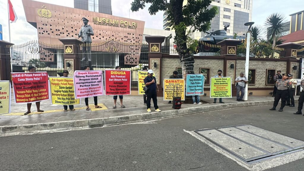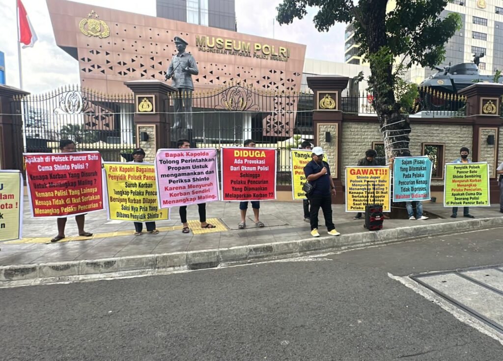 Korban pencurian yang disuruh penyidik Polsek Pancur Batu Brigadir Shinto Zelmana Sembiring menangkap dan mengamankan pelaku pencurian melakukan aksi Demo di Mabes Polri pada Jumat,12 Desember 2025 siang.