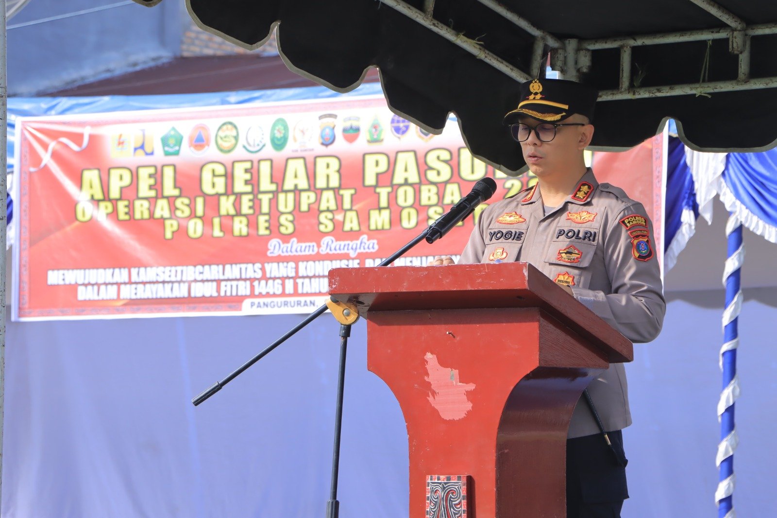 Melalui amanatnya, Kapolres Samosir menyampaikan bahwa apel ini merupakan bentuk komitmen bersama untuk memastikan kesiapan pengamanan mudik Lebaran 1446 H, yang diprediksi akan melibatkan 146,48 juta pemudik secara nasional. “Operasi Ketupat 2025 dilaksanakan serentak di seluruh Indonesia dengan tujuan memastikan mudik juga perayaan Idul Fitri berlangsung aman, tertib, dan lancar,” ucap AKBP Yogie Hardiman.