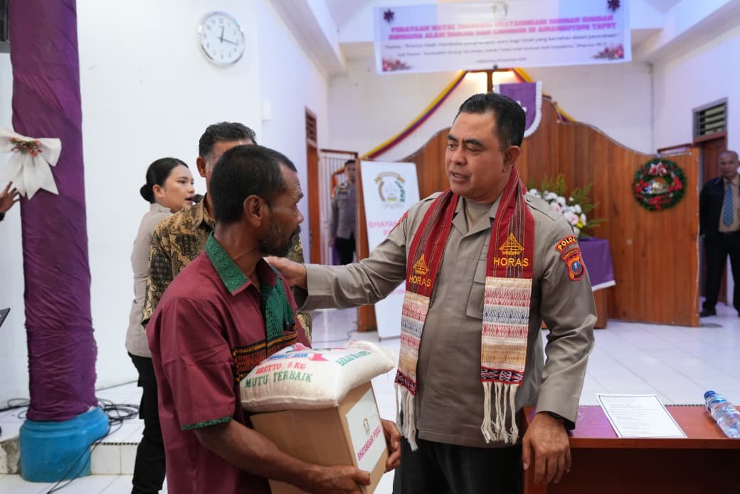 Kapolda Sumatera Utara, Irjen Pol Whisnu Hermawan Februanto, didampingi Ibu Ketua Bhayangkari Daerah Sumatera Utara, Ny. Mona Whisnu Hermawan, secara simbolis menyerahkan bingkisan Natal dan bantuan sosial kepada warga terdampak bencana.