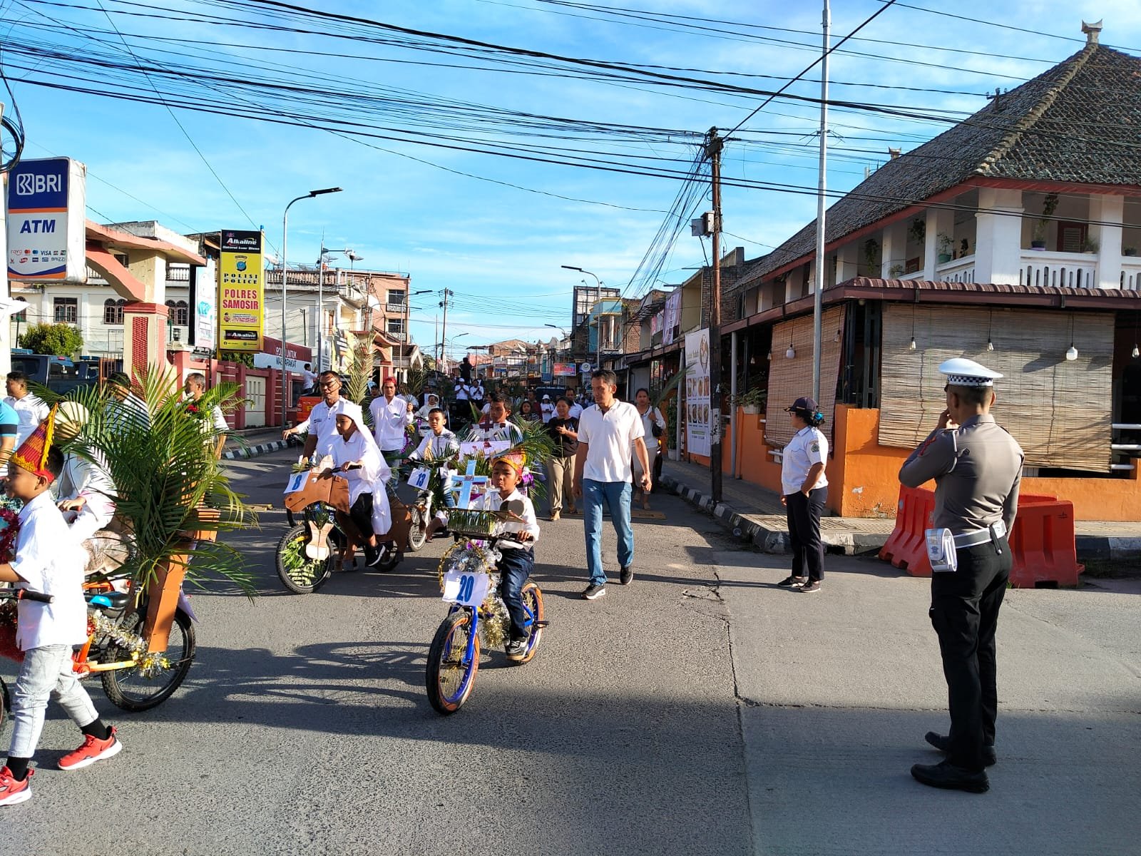 Petugas dari Satuan Lalu Lintas dan Sabhara juga melakukan pengawalan pawai umat menuju gereja, memastikan kegiatan berlangsung tertib hingga ibadah selesai.