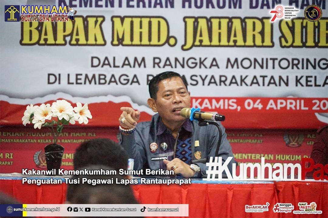 RANTAUPRAPAT :Noktahsumutcom Kepala Kantor Wilayah Kementerian Hukum dan HAM Sumatera Utara, Mhd. Jahari Sitepu, dalam rangkaian Safari Ramadhan di Lapas Rantauprapat memberikan penguatan tugas dan fungsi pegawai, Kamis (04/04/24).Dalam sambutannya, beliau menekankan pentingnya menjaga kebersamaan dalam bekerja, tetap jaga integritas dan jaga keamanan dan ketertiban di dalam Lapas. “Dukung pimpinan kalian jangan mau dipecah belah karena kita semua ini punya tujuan yang sama (Kemenkumham),” jelas Mhd. Jahari Sitepu.