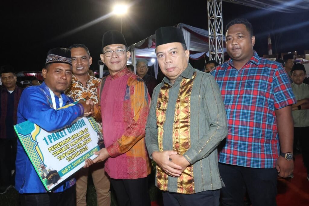 “Malam ini ada lima orang peserta yang menerima hadiah ibadah umrah ke tanah suci. Mereka ini para juara di lima cabang lomba,” sebut Ketua Umum Panitia yang juga Asisten Pemerintahan dan Kesra Setdakab Tapsel, Hamdan Zen.